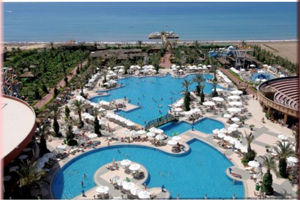 Localizare: hotelul este situat pe malul marii, la 15 km de centrul orasului Antalya si la 10 km de aeroport, Hotelul dispunde de o capacitate totala de 487 camere duble standard, 6 camere pentru persoane cu dizabilitati, 40 camere de tip family room si 24 de camere exclusive..