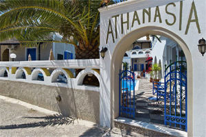 Un hotel de familie, dar potrivit si cuplurilor, frumos prin simplitate, Athanasia are o locatie excelenta in centrul statiunii. Statia de buss este la o distanta de 20 m, iar plaja la 100 m, Fira la 12km, aeroport 25 minute cu masina, facilitati hotel: sala de conferinte, aer conditionat, piscina, seif. Sezlongul si umbrela la plaja se platesc. In cadrul hotelului se serveste mic dejun continental intre orele 08:00-10:00.