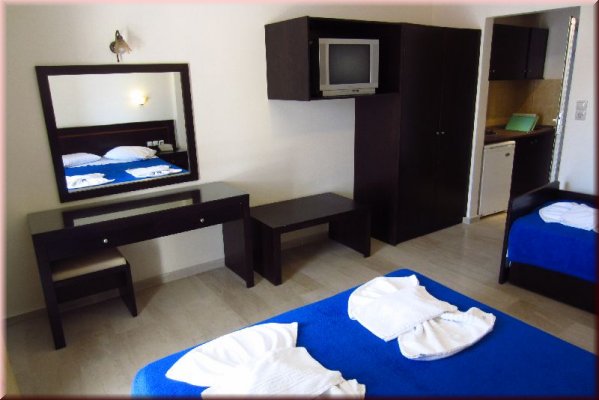 Camere: baie cu cada sau dus, chicineta, frigider, aer conditionat (contra cost: 5 eur/zi), televizor, telefon, radio, balcon sau terasa. Capacitate maxima studio: 2 adulti + 2 copii sau 3 adulti + 1 copil. Capacitate maxima studio promo: 2 adulti + 2 copii sau 3 adulti + 1 copil. Patut pentru infant: 20 eur/camera /saptamana (la cerere).