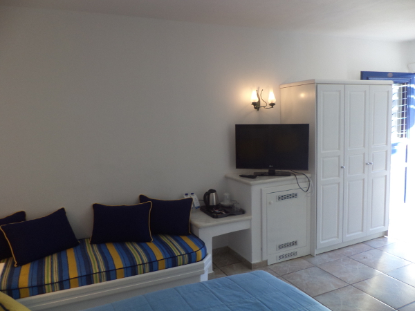 Dotari camere: Camerele standard au un aspect fresh si sunt doate cu telefon, aer conditionat, televizor, radio, mini frigider, seif, uscator de par. Camerele deluxe sunt mai mari decat camerele standard si majoritatea ofera vedere spre mare. Toate camerele au balcon/terasa. Camerele Cycladic Junior Suites sunt spatioase si includ o zona de zi cu 2 canapele (unde pot dormi 2 copii) si o zona de dormit. Au un desing elegant si sunt dotate cu televizor cu ecran plat, DVD player, telefon, aer conditionat, radio, mini frigider, seif, uscator de par, halate si papuci de baie. Aceste camere au un balcon/terasa cu vedere spre mare (partiala sau frontala).