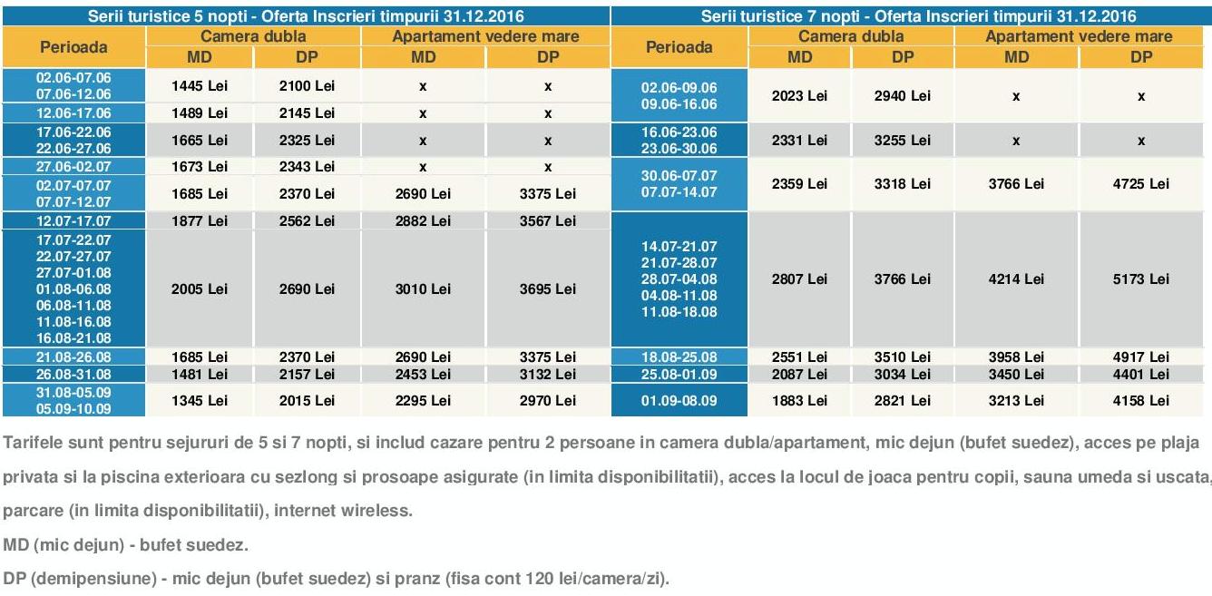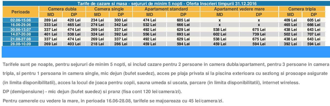 Discount 25% din tarifele de cazare cu mic dejun pentru orice rezervare de minim 5 nopti efectuata si achitata pana la 31.12.2016, vezi tabelul de tarife discountul este deja aplicat (da click pe imagine pentru marire)
